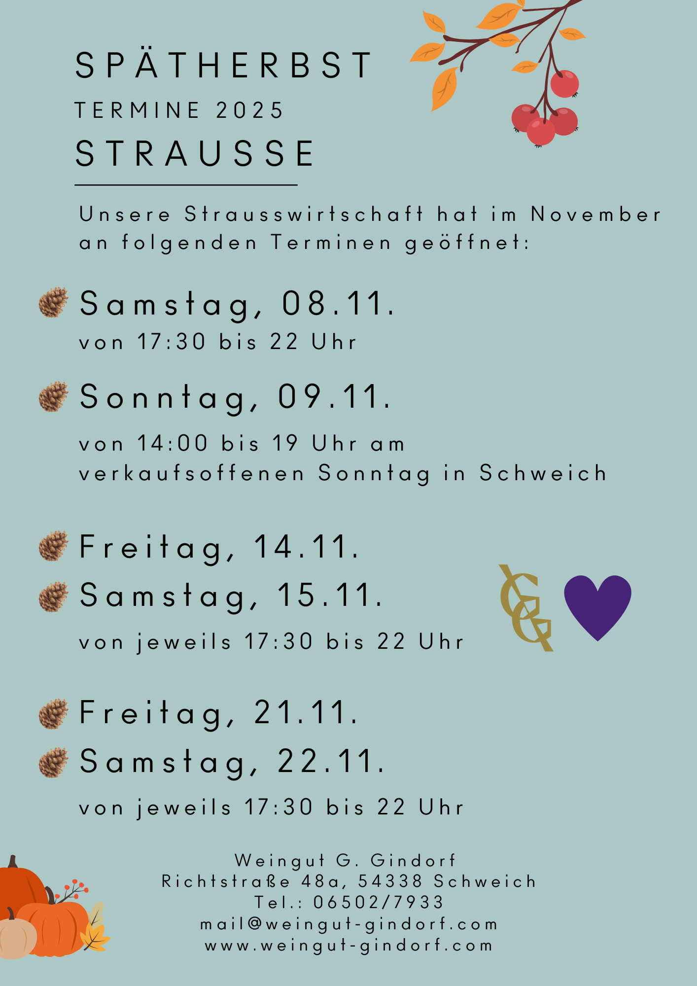 Im November öffnen wir noch einmal unsere Straußwirtschaft und freuen uns auf gesellige Abende mit euch!