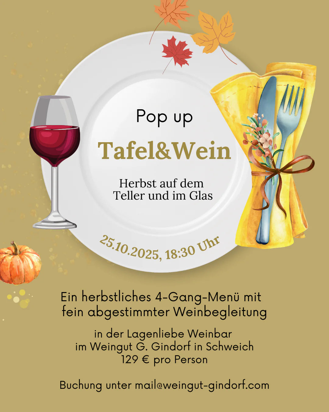 Ein Abend für Genießer: Freut euch auf ein herbstliches 4-Gang-Menü von Rose Bellersheim, begleitet von fein abgestimmten Weinen aus unserem Weingut G. Gindorf. Regional, saisonal & mit Liebe gemacht – in gemütlich-stilvollem Ambiente.